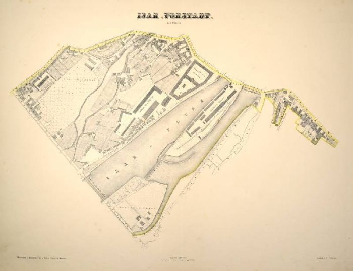 MÜNCHEN. - Plan. - Isar - Vorstadt in 3 Blättern. Plan des Isarlaufs von der Brudermühle bis zur Zweibrückenstraße mit der Ludwigsbrücke, jeweils mit dem Gebiet bis Thalkirchner- und Müllerstraße.