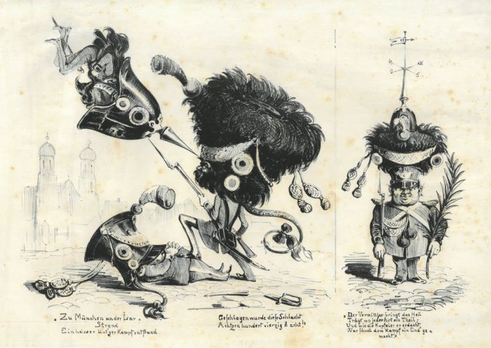 Zu München an der Isar Strand usw. Vor den Türmen der Frauenkirche kämpfen Militär, Bürgerwehr und Pickelhaube gegeneinander. Rechts als "Vermittler" ein Uniformierter, der alle drei Kopfbedeckungen übereinander trägt.