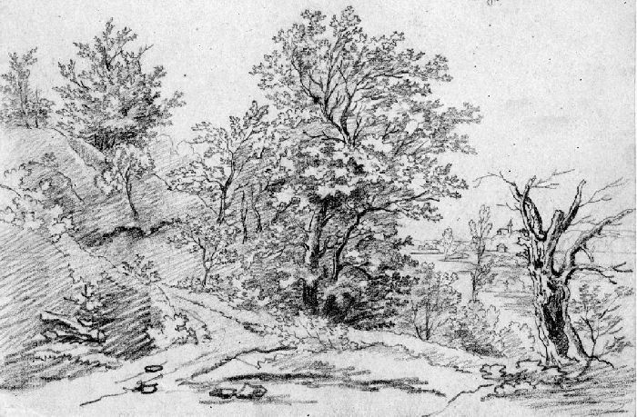 Auf grünem Zeichenpapier. Verso: "Kalkofen". Skizze mit Gebüsch und Wurzelwerk in ausgeschwemmten Kuhlen. Bleistiftzeichnung, bez. wie oben und dat. "2. Juni 1830", 13 x 28 cm. Beiliegt: "Forst Harlaching". Blick auf alte Bäume (Hochformat), verso ebenso (Querformat). Bleistiftzeichnungen, bez. wie oben und dat. "14. Juny 1828", 28,5 x 21 cm (Blattgröße). Insgesamt vier Darstellungen auf zwei Blättern.