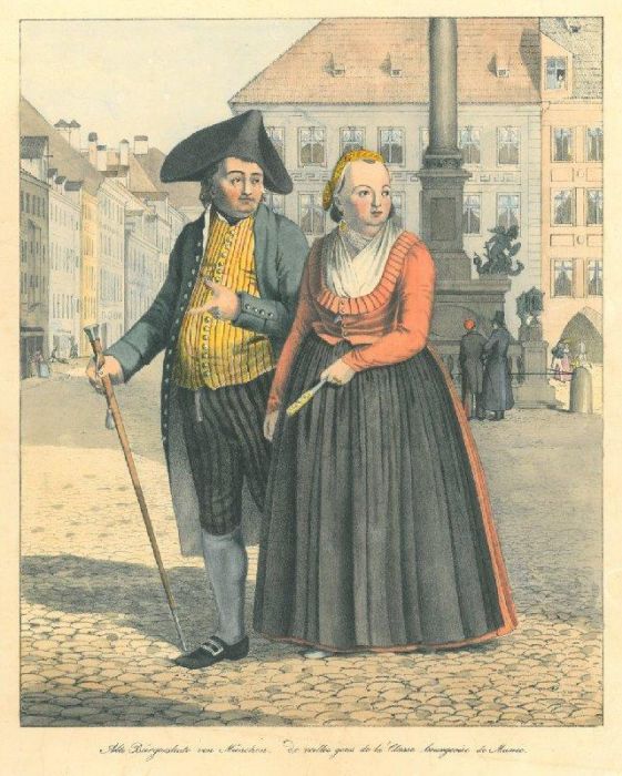 MÜNCHEN. - Tracht. - Alte Bürgersleute von München. Münchner Paar in Sonntagstracht, mit Dreispitz bzw. Riegelhaube "promenirend am Marienplatz" (Maillinger), dahinter rechts die Mariensäule, links die Häuser der Kaufingerstraße, u