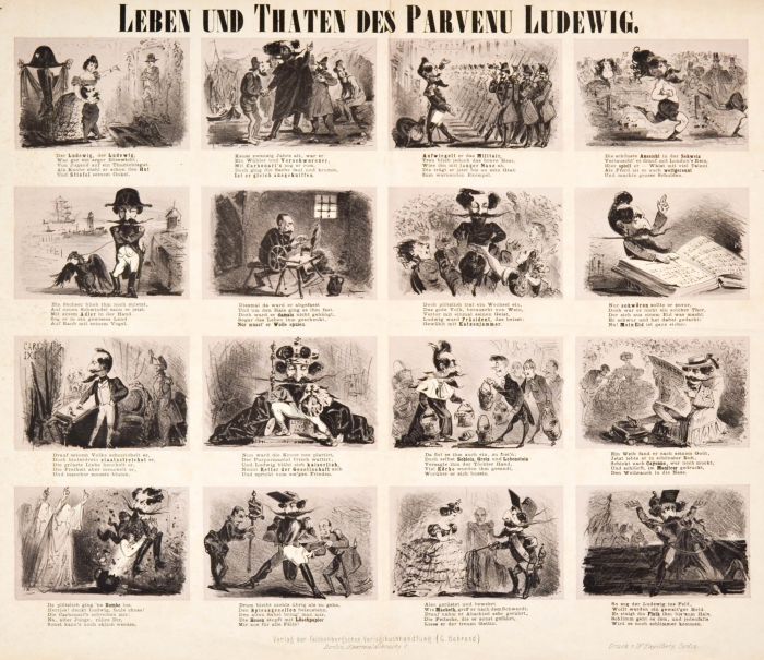 Leben und Thaten des Parvenu Ludewig. Sechzehn Karikaturen aus dem Leben Kaiser Napoleons III. mit jeweils einem fünfzeiligen Reim auf einem Blatt.