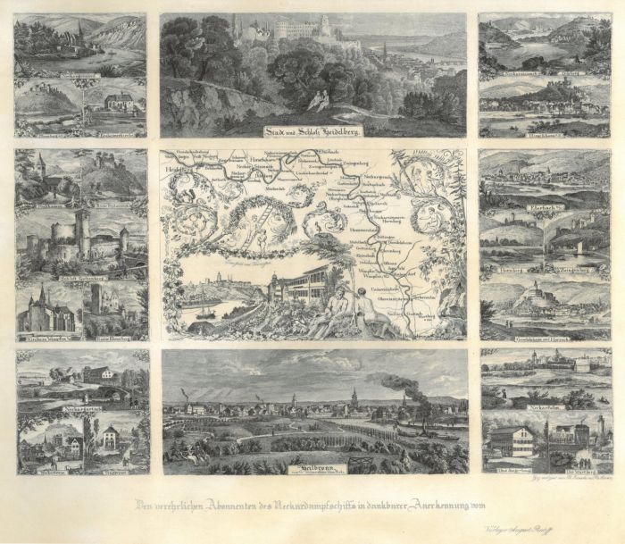 Am oberen Rand Gesamtansicht von Heidelberg, unten von Heilbronn. Seitlich zahlreiche feine, kleine Ansichten der Umgebung des Neckars. Am unteren Rand mit Widmung "Den verehrlichen Abonnten des Neckardampfschiffs in dankbarer Anerkennung vom Verleger August Ruoff". - Sehr selten.