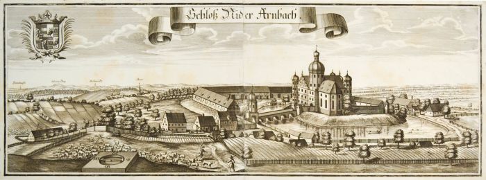 Schloß Nider Arnbach. Wasserschloß und Ort, im Hintergrund die Orte Brunnen und Probenhausen.