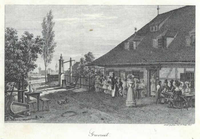 Grosreut. Ansicht des Ausflugslokals mit vielen Gästen, in der Ferne die Türme der Stadt.