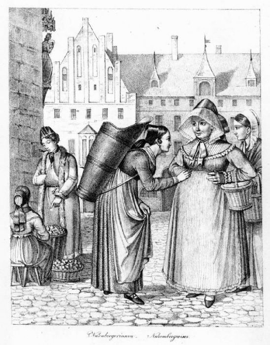 NÜRNBERG. - Tracht. - Nürnbergerinnen. Drei sich unterhaltende Frauen in bürgerlicher Tracht in der Stadt, links Äpfelverkäuferin.