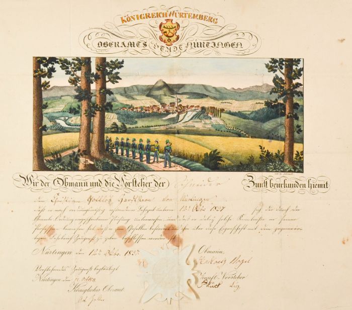 Schefold 5765 (ohne Angabe von Größe u. Stecher); nicht bei Stopp. - Im Vordergrund Militär, weiter Blick über Getreidefelder und den Neckar. - Mit geglätteten Faltspuren, und teils braunfleckig. - Die dekorative und sehr seltene Kundschaft zur Zunft der Schneider, ausgefüllt und datiert, mit Papiersiegel.