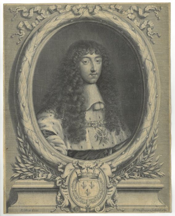 Brustbild nach halbrechts im Oval des Herzogs von Orleans und Bruder Ludwigs XIV., mit dem Orden vom Heiligen Geist an einer Collane. Unten Wappen.