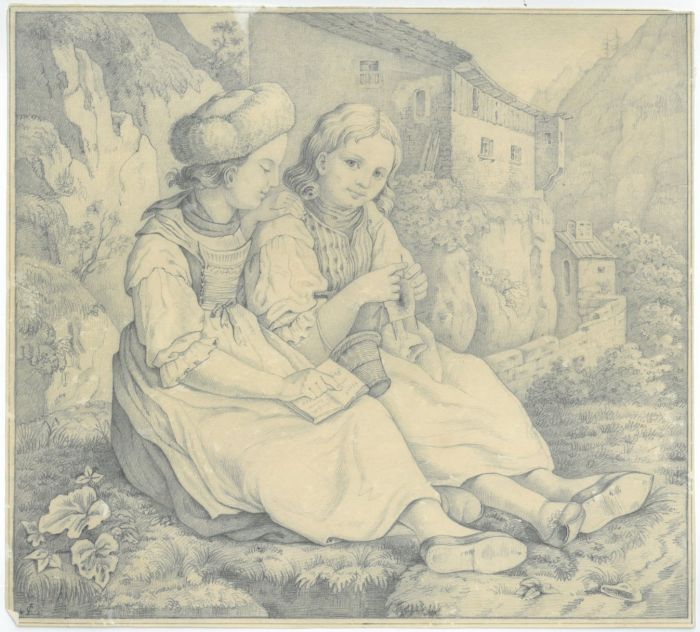 PHILIPP HEINEL (1800 - 1843). - Zwei oberbayerische Mädchen (Andresen). Blick in ein enges Tal mit schroffen Felsen, mittig ein schindelgedecktes Bauernhaus mit Pultdach. Im Vordergrund sitzen zwei Mädchen auf dem Boden, die barhäuptig