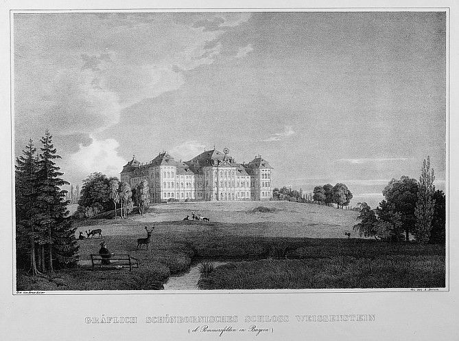 POMMERSFELDEN. - Gräflich schönbornisches Schloss Weissenstein (ob Pommersfelden in Bayern), mit mehreren Damhirschen im Vordergrund.