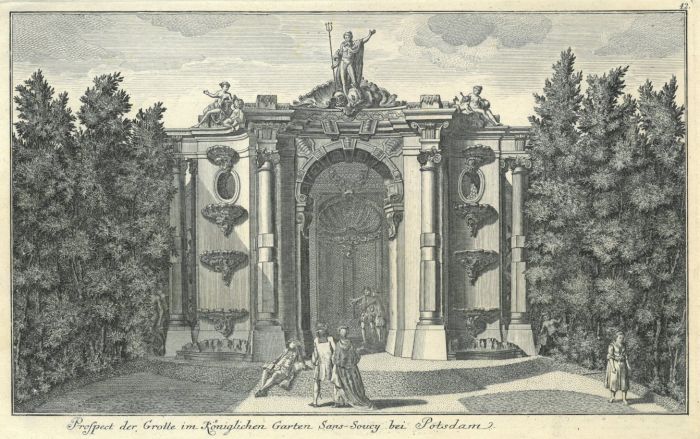 Prospect der Grotte im Königlichen Garten Sans-Soucy bei Potsdam, im Vordergrund mehrere Personen.