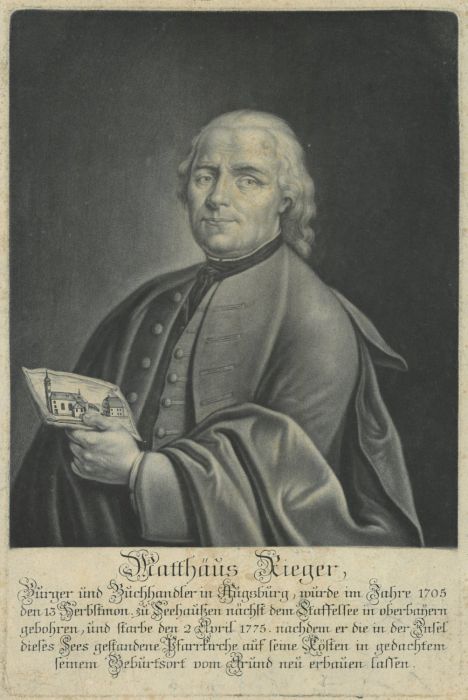 APK 21138. - Rieger wurde in Seehausen am Staffelsee geboren. Er ließ die Kirche auf der Insel im Staffelsee neu erbauen. - Alt aufgezogen und gering fleckig und gebräunt.