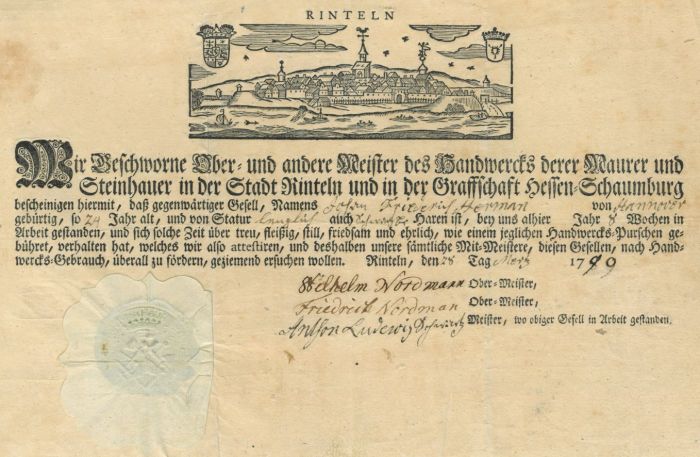 RINTELN. - Gesamtansicht (ca. 5 x 13,5 cm) als Kopf auf einer Handwerkskundschaft, mit Papiersiegel unten links.