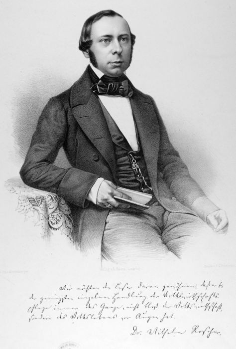 ROSCHER, Wilhelm (1817 - 1894). - Hüftbild nach viertelrechts des Nationalökonomen in Göttingen und Leipzig, unten sein Grundsatz der Volkswirtschaftslehre mit Unterschrift in Faksimile.