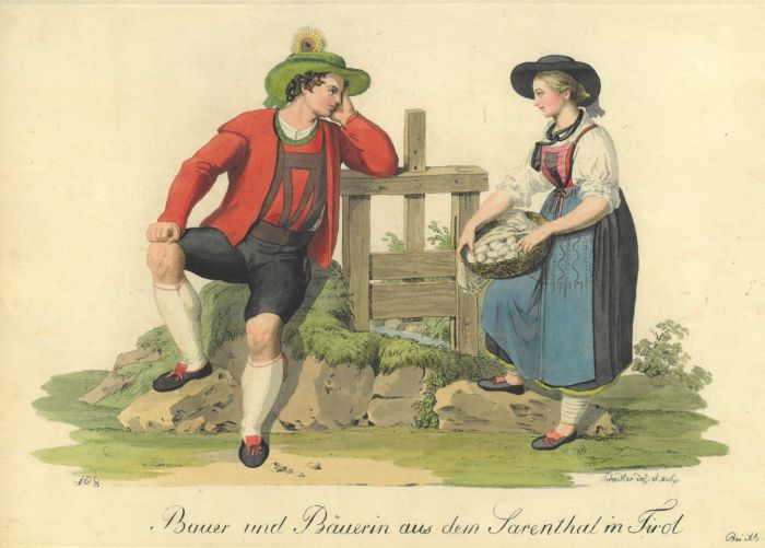 SARNTAL. - Tracht. - Junger im Freien sitzender Bauer, daneben Mädchen mit Eierkorb in Sarntaler Tracht.