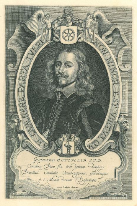 SCHEPELER, Gerhard (1615 - 1674). - Brustbild nach halblinks im Schriftoval des Bürgermeisters von Osnabrück während der Friedensverhandlungen 1649, oben das Stadtwappen, unten das Familienwappen.