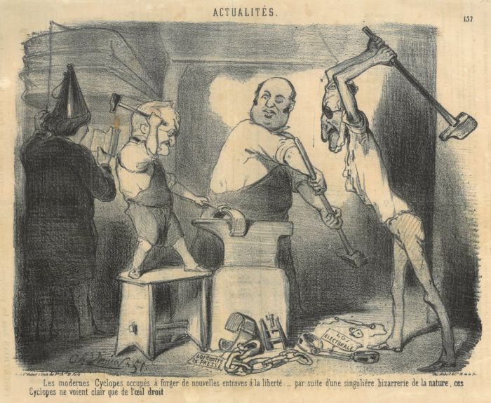 Les modernes Cyclopes occupés à forger de nouvelles entraves à la liberté. Die Politiker Adolphe Thiers, Louis-Mathieu Mole und André Dupin (von links nach rechts) stehen um einen Amboss und schmieden die Fesseln, mit denen die Freiheiten der Republik eingeschränkt werden sollen.