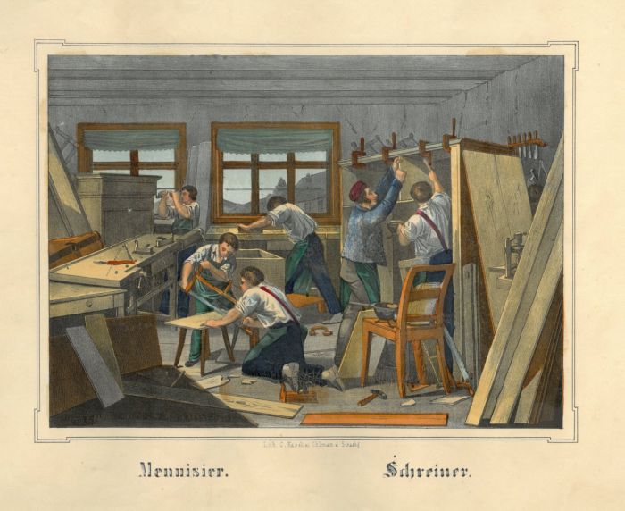 SCHREINER. - Menuisier. Schreiner. Blick in eine Schreinerwerkstatt mit Arbeitern, die einen Schrank bauen.