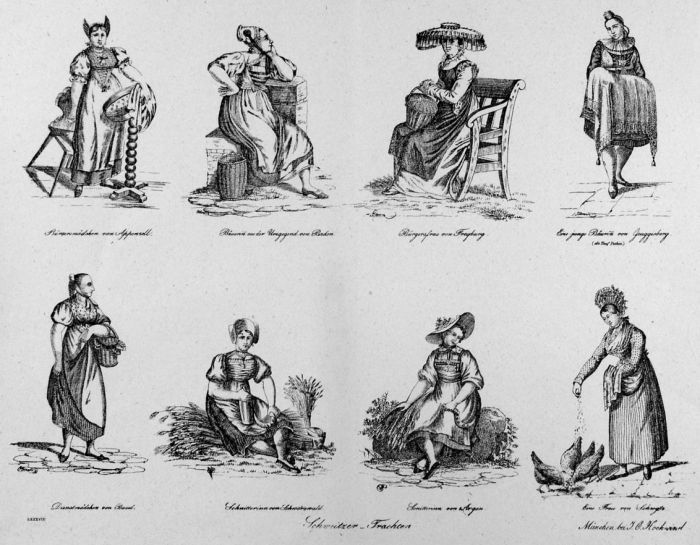 SCHWEIZ. - Trachten. - Schweitzer - Trachten. Acht verschiedene Frauentrachten aus verschiedenen Gegenden der Schweiz (6) und aus Baden (2).