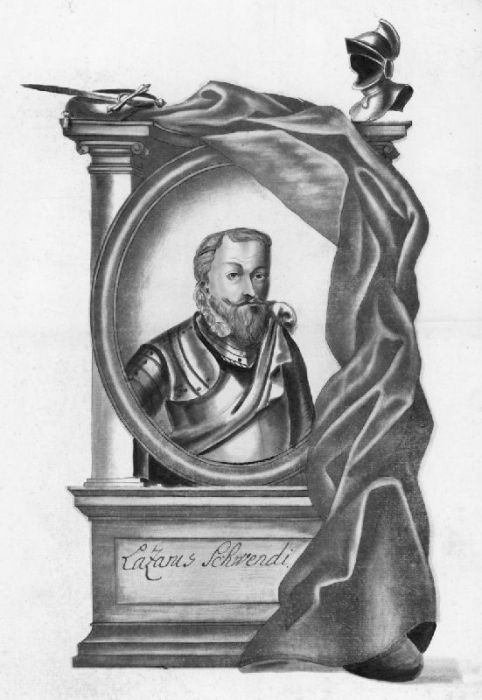 SCHWENDI, Lazarus von, Freiherr zu Hohenlandsberg (1522 - 1584). - Brustbild nach halbrechts im Oval des Militärschriftstellers und kaiserlichen Feldherrn gegen die Türken in Ungarn, in Rüstung mit Feldbinde, umrahmt von Architektur mi
