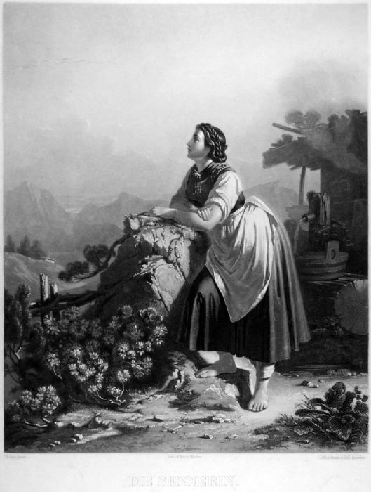 SENNERIN. - Junge Sennerin mit geflochtenem Haarkranz lehnt barfuß im Dirndl vor ihrer Almhütte an einem Felsen, in die Ferne blickend, im Vordergrund ein Strauch mit Alpenrosen, im Hintergrund die Berge.
