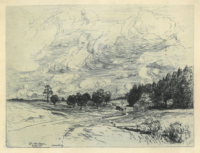 Weigmann Nr. 128. - In der Platte sign., dat. und bezeichnet, sowie am unteren Rand mit Bleistift "A happy New Year 1897 SLWenban". Typisches, stimmungsvolles Blatt des Künstlers, der mit seinen Landschaftsradierungen der Münchner Schule neue, eigene Akzente setzte.