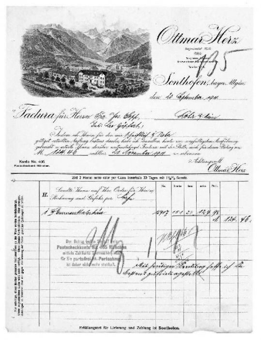 SONTHOFEN. - Ansicht der Käsefabrik Ottmar Herz als Kopf eines Rechnungsbogens.