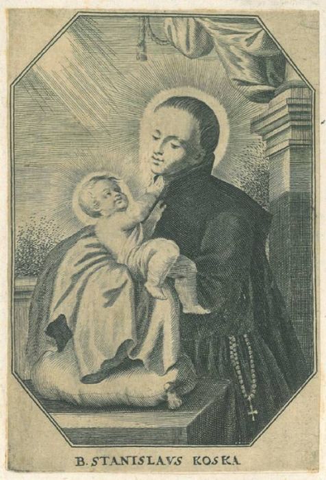 STANISLAUS KOSTKA. - Hüftbild nach dreiviertellinks im Achteck des Jesuiten, stehend im Talar mit dem Jesuskind auf den Armen.