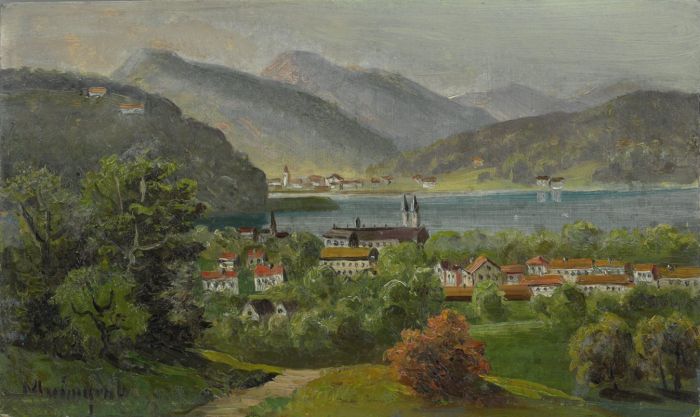 TEGERNSEE. - Blick von einer Anhöhe auf Kloster und Ort, im Mittelgrund der See, Rottach-Egern und die Berge.
