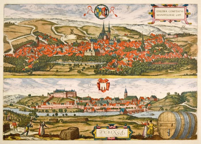 TÜBINGEN. - Gesamtansicht von Süden, links Weinlese (15,5 x 46 cm), darüber Gesamtansicht von Eisleben, (17,5 x 46 cm).