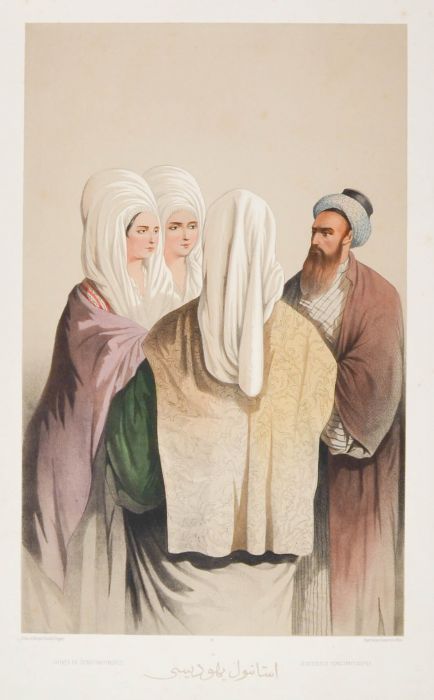 TÜRKEI. - Judentum. - Juives de Constantinople - Jevesses of Constantinople. Eine Gruppe von drei Frauen und einem Mann in orientalischer Tracht stehen im Kreis. Darunter Titel in Französisch, Englisch und Arabisch.