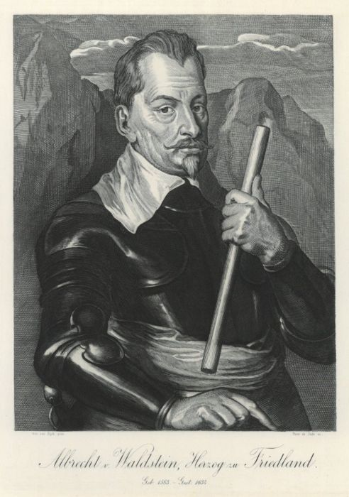 WALLENSTEIN, Albrecht Graf von (1583 - 1634). - Hüftbild nach halbrechts, in Rüstung mit Marschallstab in der Linken, im Hintergrund Felsengebirge.