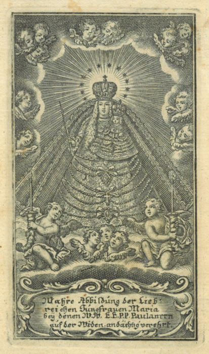 Wahre Abbildung der Liebreichen Jungfrauen Maria bey denen W.W. E.E. P.P. Paulanern auf der Widen andächtig verehrt. Das Gnadenbild in Wolken mit Engelreigen, unten Kartusche mit Inschrift.