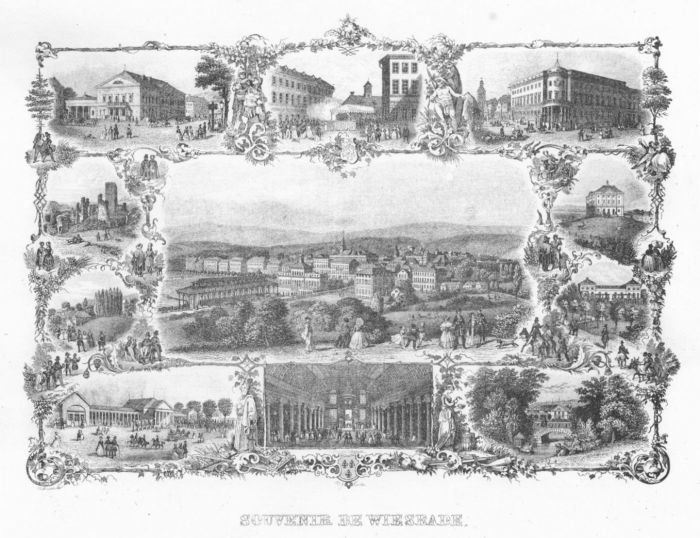 Souvenir de Wiesbade. Gesamtansicht, umgeben von 10 Ansichten in ornamentaler Umrandung.
