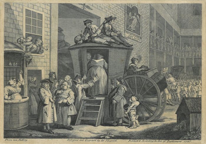 WILLIAM HOGARTH (1697 - 1764). - The Stage-coach an Election Procession in the yard, die Landkutsche im Hofe des Wirtshauses, oder die Wahlprozession im Hof (Nagler).