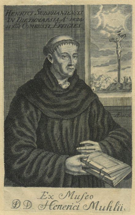 Henrici Sudphaniensis in Diethmarsia A°. 1524. Hüftbild des Reformators nach halbrechts mit Buch in Händen, rechts neben ihm der Blick durch ein Fenster auf Golgatha.